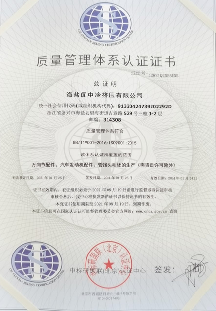 海鹽聞中冷擠壓有限公司產(chǎn)品主要用于汽車、輪船及各種傳動(dòng)設(shè)備,生產(chǎn)采用先進(jìn)的冷擠壓工藝,在企業(yè)成立的短短幾年中,就贏得了客戶的一致好評(píng),產(chǎn)品主要遠(yuǎn)銷省內(nèi)外。 企業(yè)全體員工,無(wú)不秉承“銳意進(jìn)取、開(kāi)拓創(chuàng)新、精益求精、質(zhì)量取勝”的宗旨,兢兢業(yè)業(yè),同心協(xié)力,努力使企業(yè)的生產(chǎn)質(zhì)量更上一層樓。